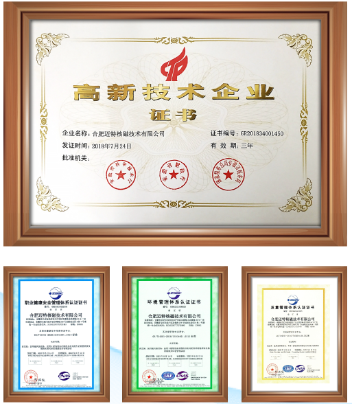 合肥邁特核磁技術有限公司為國家級高新企業(yè),通過質量管理體系認證、環(huán)境管理體系認證和職業(yè)健康安全管理體系認證。