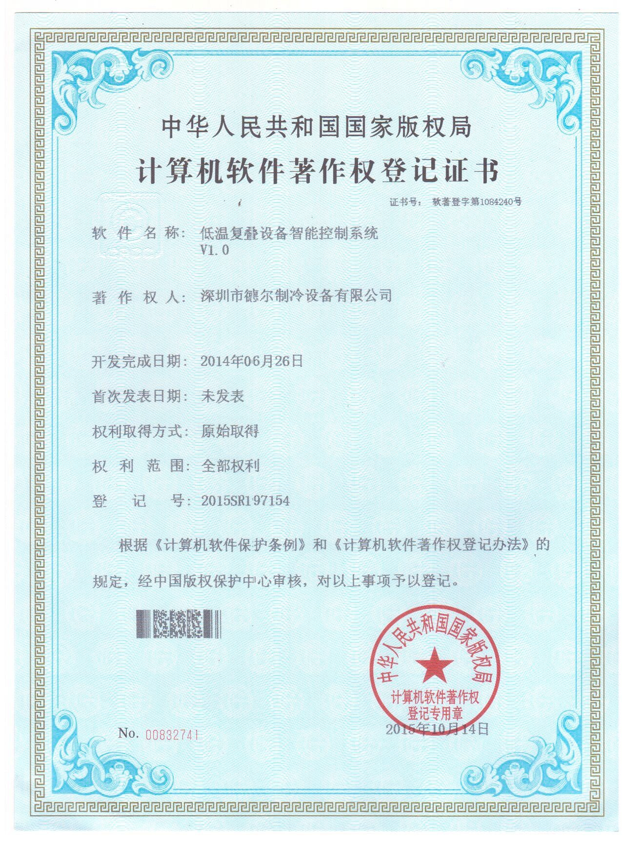 低溫復疊設備智能控制系統 軟件著作權登記證書