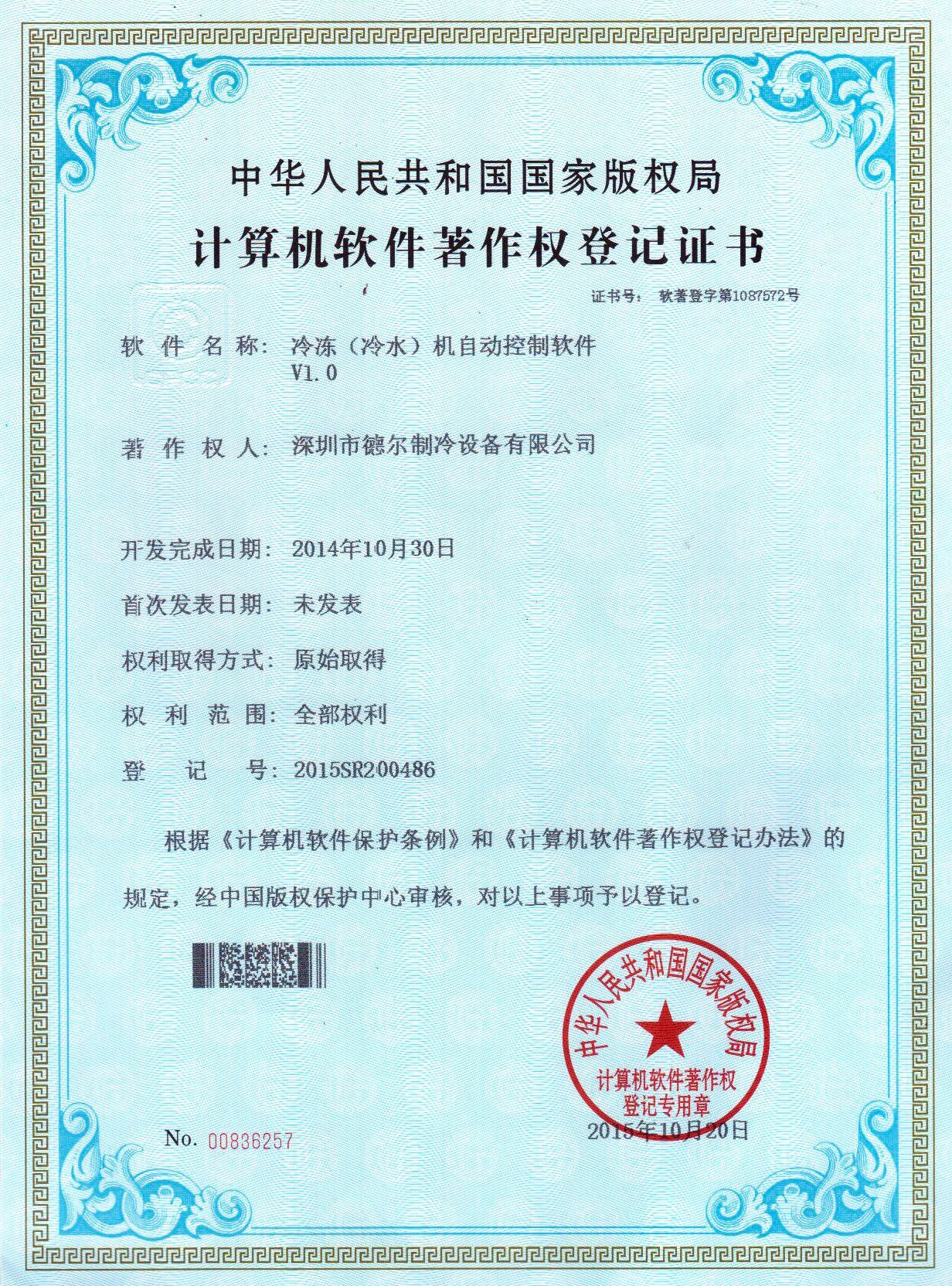 冷凍(冷水)機自動控制系統 軟件著作權證書