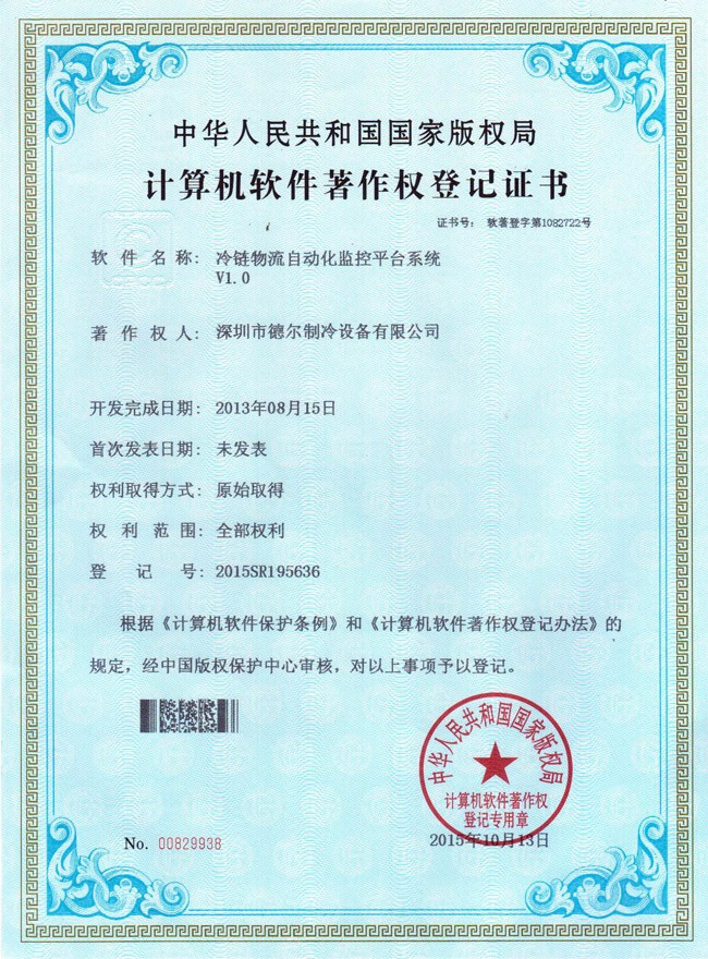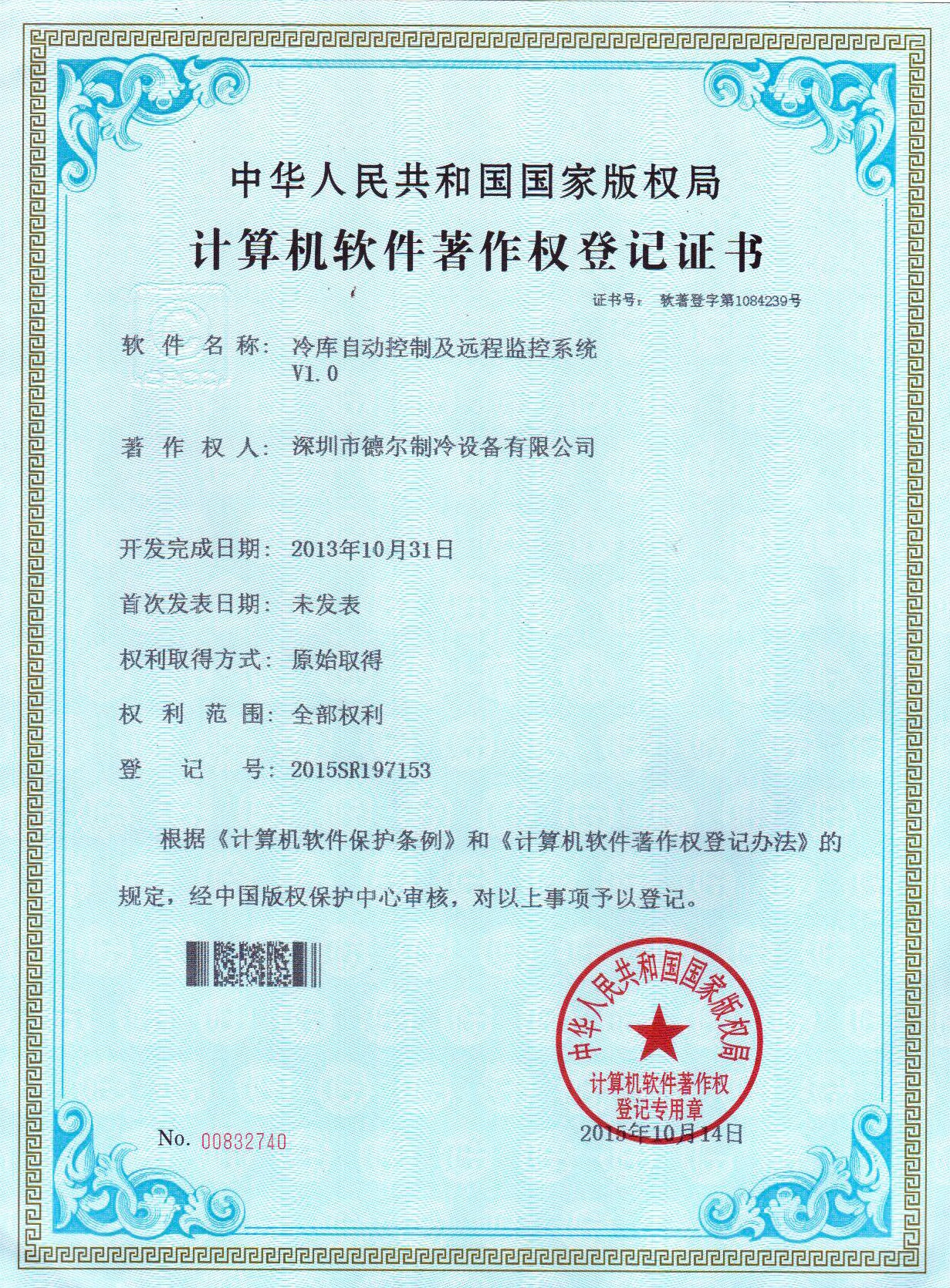 冷庫自動控制及遠程監控系統 軟件著作權證書